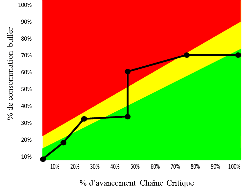 Si le retard d'une tâche critique consomme du tampon projet, une avance sur une tâche critique le reconstitue ; il est possible de regagner du tampon. Le chef de projet doit ainsi se focaliser sur la Chaîne Critique et suivre l’avancement du projet à travers la consommation des tampons.