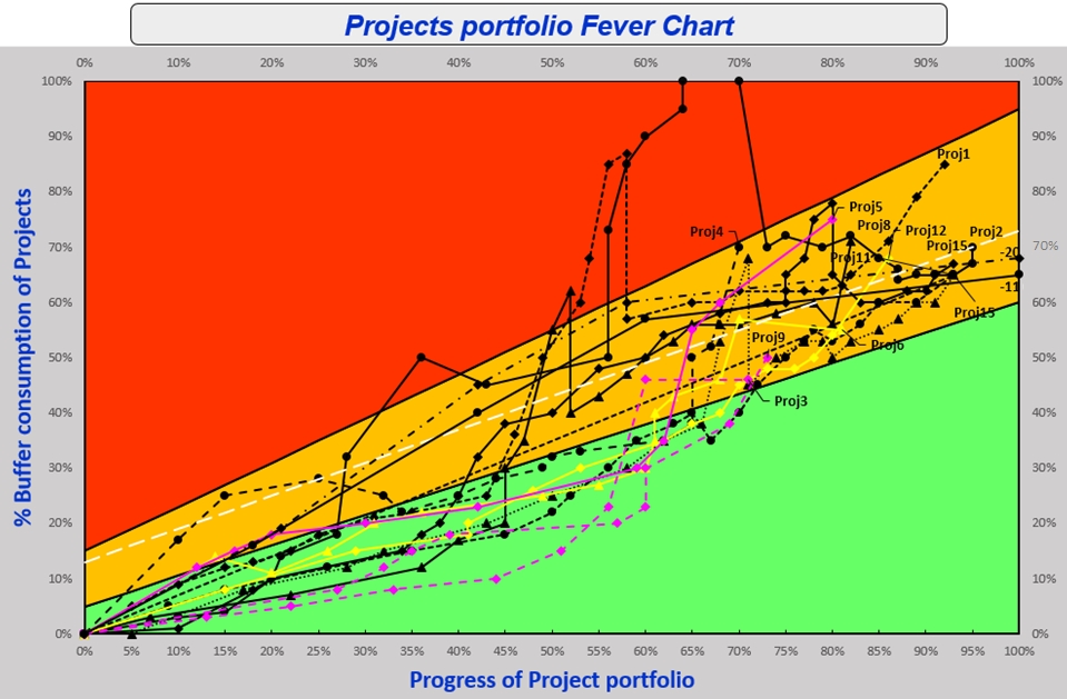 Pilotage selon la Chaîne Critique des projets individuels et du portefeuille de projets, avec l'utilisation de mascottes et l'établissement des Fever Chart, et notamment de la Fever Chart comme outil d'aide à la prise de décision (arbitrage dynamique des conflits de ressources).